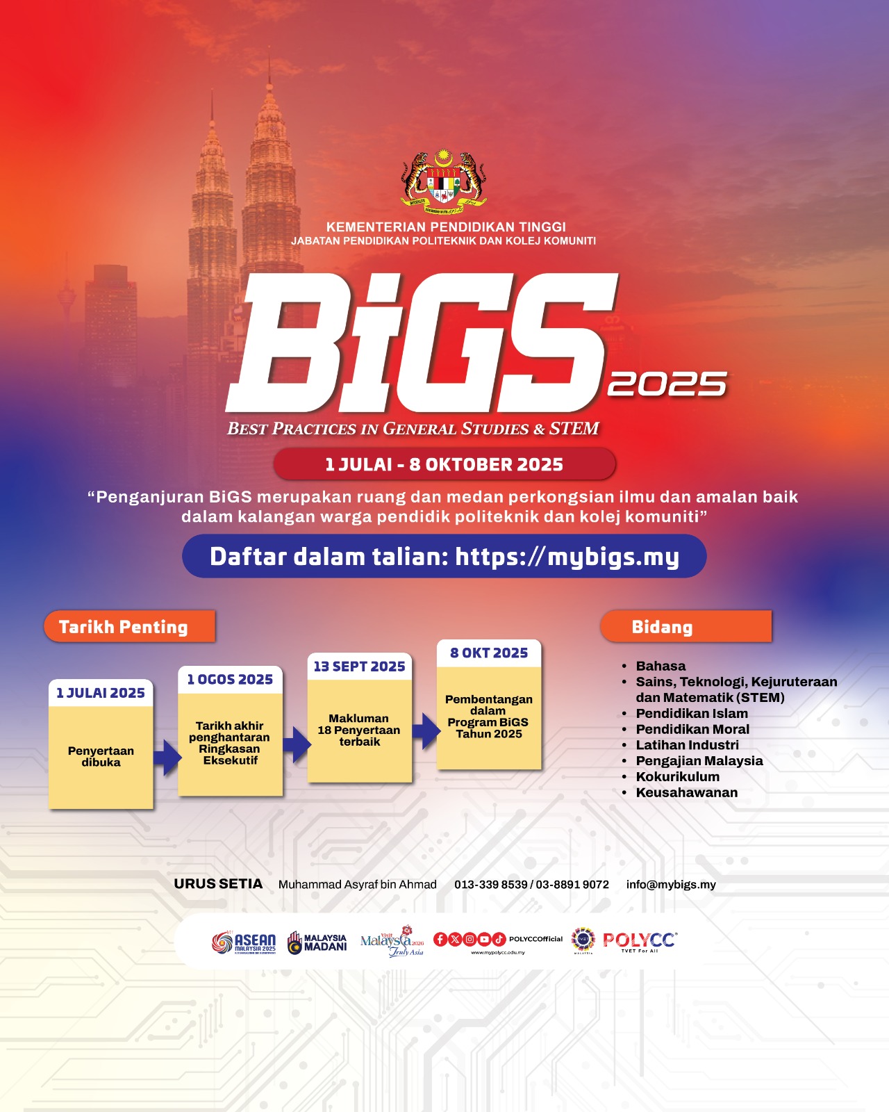 “Best Practices” ataupun Amalan Baik merujuk kepada pelbagai aktiviti, dasar, dan pendekatan programatik yang dijalankan oleh pendidik atau pensyarah untuk mencapai perubahan positif dalam sikap pelajar atau tingkah laku akademik. Perubahan positif yang dicapai melalui bukti dan eviden daripada pelajar dan institusi wajar dan patut disebarluas, dikongsi dan dicontohi oleh warga pendidik yang lain. Amalan baik yang dicontohi dan diamalkan ini dilihat mampu merealisasikan hasrat pengenalan Mata Pelajaran Umum (MPU) dalam melahirkan graduan yang holistik, menghayati nilai-nilai patriotisme dan jati diri beracuan Malaysia serta menguasai kemahiran insaniah ke arah memenuhi kebolehpasaran kerja. Ia juga bakal memberi impak positif kepada politeknik dan kolej komuniti dalam proses menjadi institusi TVET terulung di Malaysia. Justeru itu, Unit Pengajian Umum, Matematik, Sains dan Komputer (UPU) Bahagian Kurikulum, Jabatan Pendidikan Politeknik dan Kolej Komuniti menyahut cabaran dan seruan ini dalam membantu menyebarluaskan dan menyuburkan perkongsian amalan baik bidang pendidikan di Malaysia. i. Penghantaran Ringkasan Eksekutif: 1 hingga 31 Julai 2025 ii. Makluman 18 Penyertaan Terbaik: 13 September 2025 iii. Pembentangan: 8 Oktober 2024